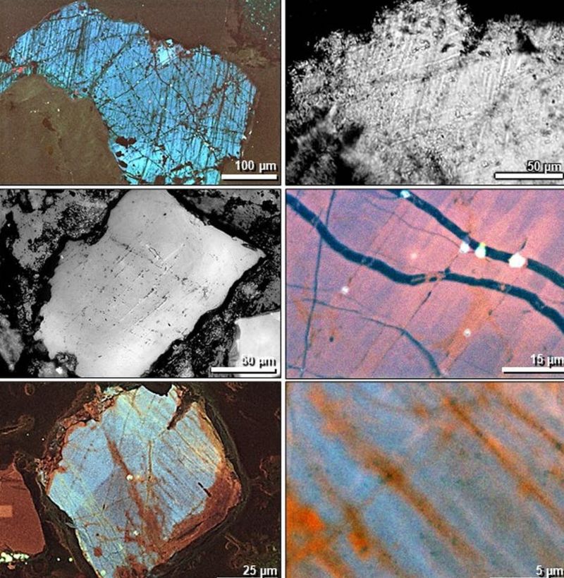 Pie de foto,Imágenes de microscopio electrónico de numerosas pequeñas grietas en granos de cuarzo impactados. Allen West, CC BY-ND