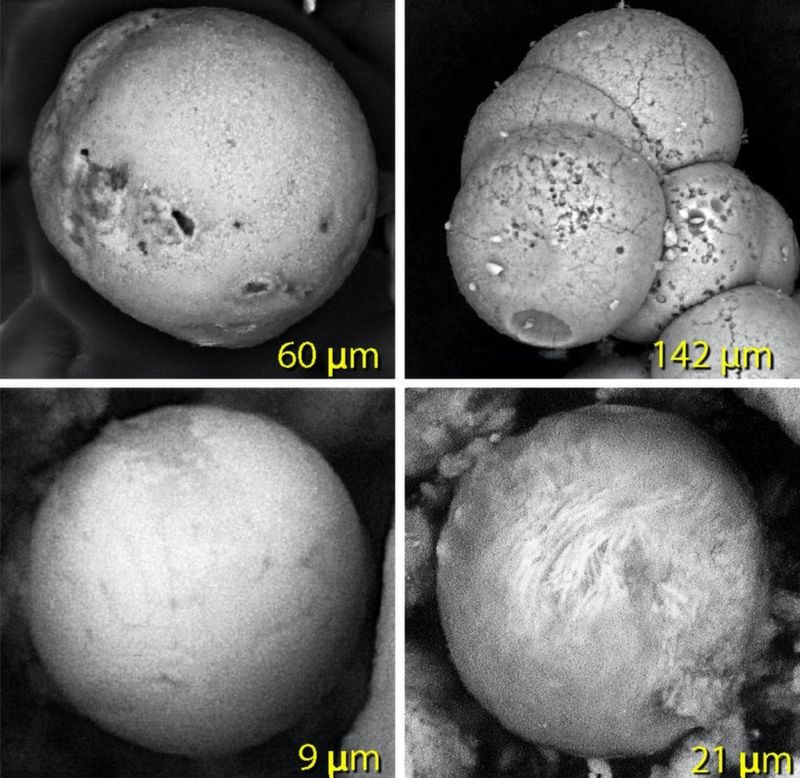 Pie de foto,Esférulas hechas de arena derretida (arriba a la izquierda), yeso de palacio (arriba a la derecha)metal derretido (dos de abajo). Malcolm LeCompte, CC BY-ND