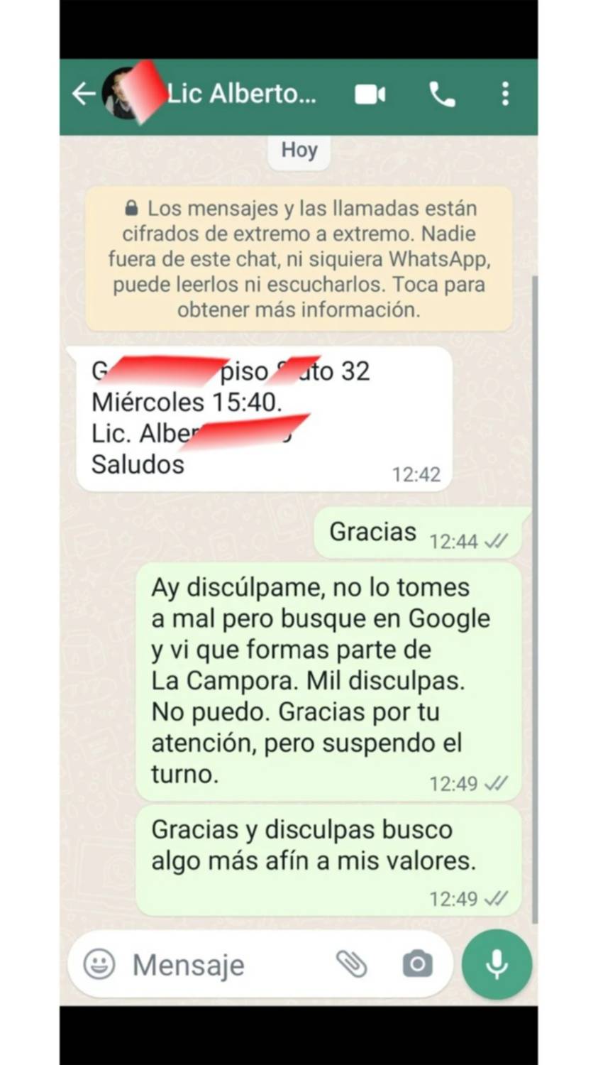 Al ver que el psicólogo le confirmó el día y el horario del turno, ella le respondió: “Ay disculpame, no lo tomes a mal pero busqué en Google y vi que formás parte de La Cámpora. Mil disculpas. No puedo. Gracias por tu atención pero suspendo el turno”. Y luego, agregó: “Busco algo más afín a mis valores”.