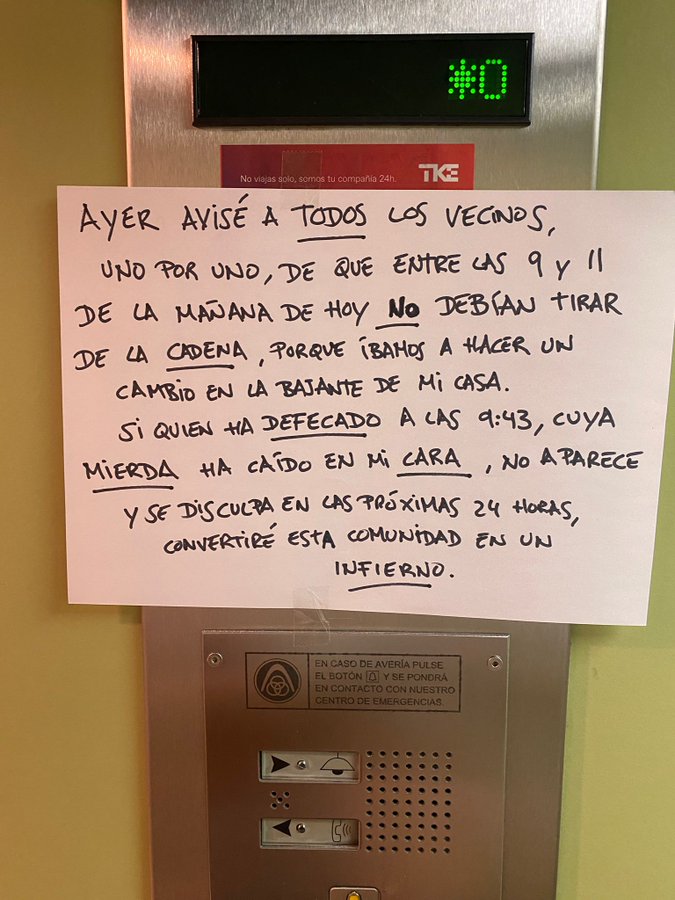 “Ayer avisé a todos los vecinos, uno por uno, de que entre las 9 y 11 de la mañana de hoy no debían tirar de la cadena, porque íbamos a hacer un cambio en la bajante de mi casa. Si quien ha defecado a las 9:43, cuya mier... ha caído en mi cara, no aparece y se disculpa en las próximas 24 horas, convertiré esta comunidad en un infierno”, se puede leer en la nota que dejaron pegada en el ascensor del establecimiento en cuestión.