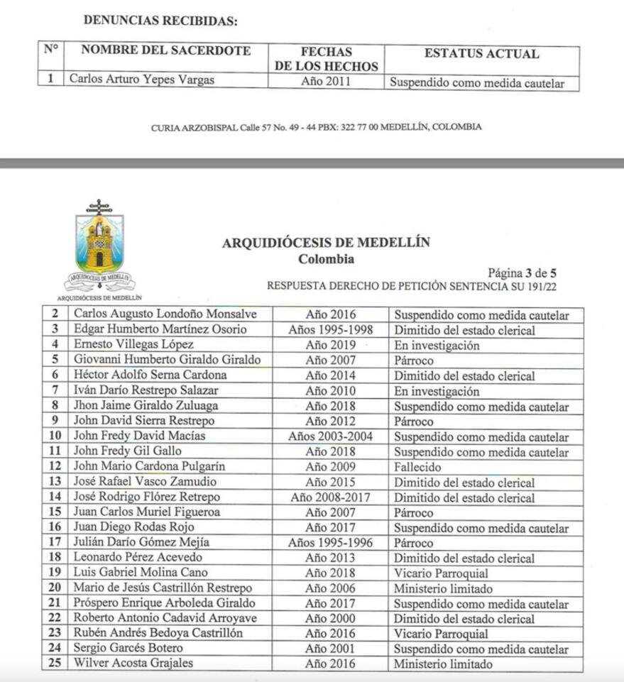 Ese día, el arzobispo de la ciudad, monseñor Ricardo Tobón Restrepo, publicó en redes sociales una lista con los nombres de 36 sacerdotes que habían sido denunciados ante la Arquidiócesis en los últimos 30 años.